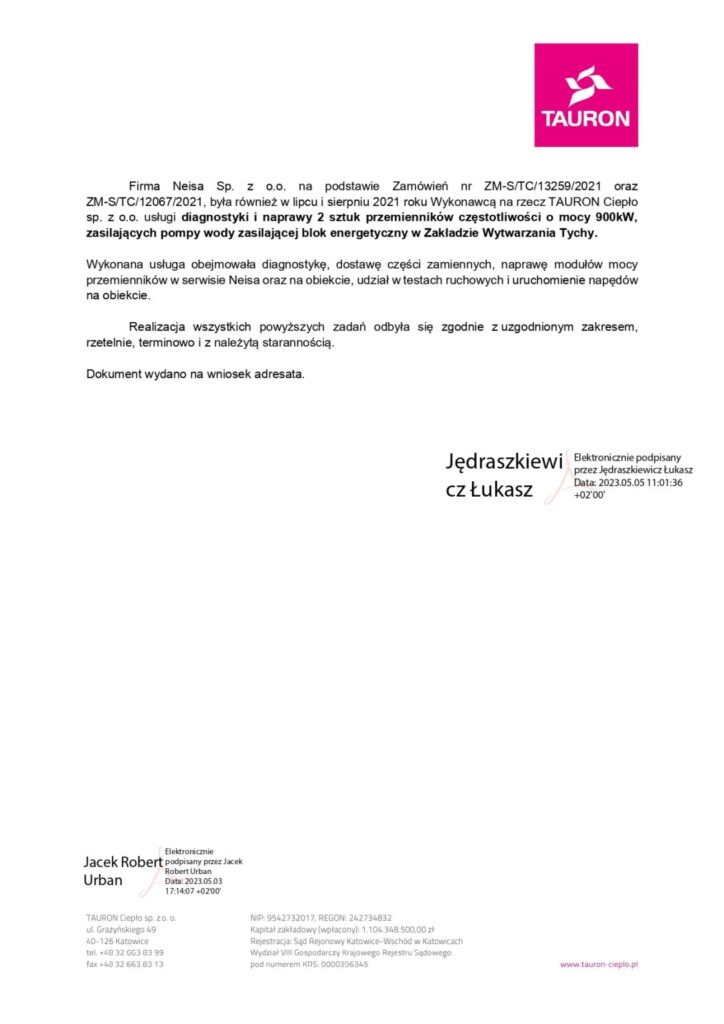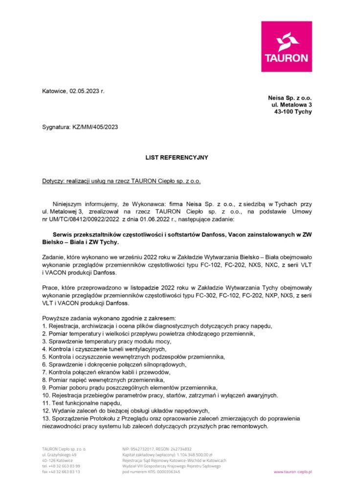 Na rzecz spółki TAURON Ciepło wykonywaliśmy przeglądy i serwisy przemienników częstotliwości oraz softstartów. Przeprowadziliśmy m.in. testy funkcjonalne napędów, pomiar napięć wewnętrznych, kontrolę i czyszczenie podzespołów.